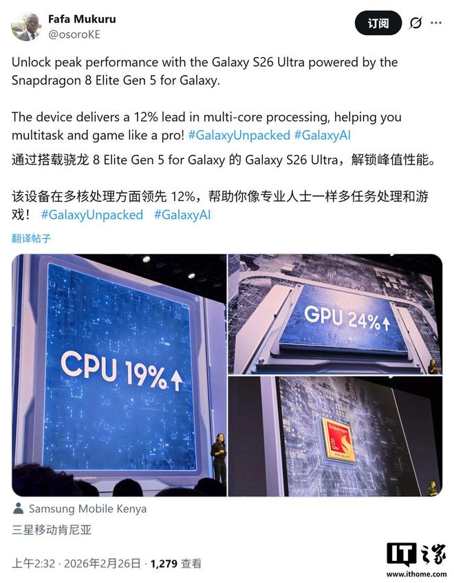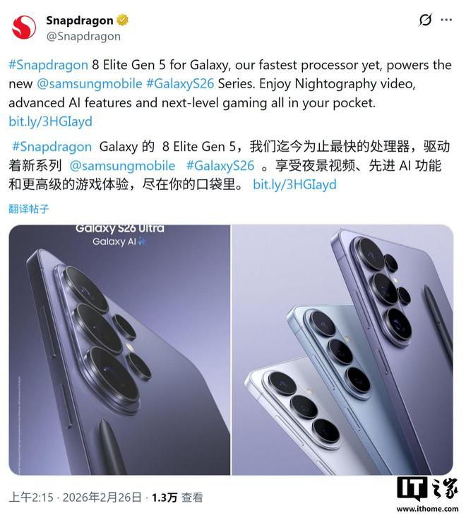 2 月 26 日消息,高通公司今天(2 月 26 日)发布博文,宣布在三星的 Galaxy S26 系列手机发布会上,推出了其迄今最快处理器:第五代骁龙 8 至尊版定制芯片(Snapdragon 8 Elite Gen 5 for Galaxy)。