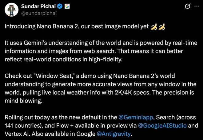 谷歌CEO皮查伊发帖声称:「这是我们迄今为止最好的图像模型。」