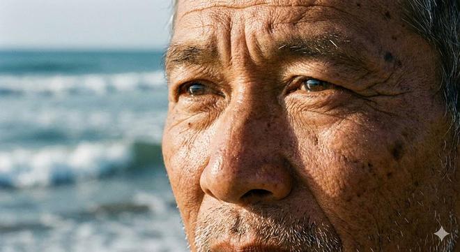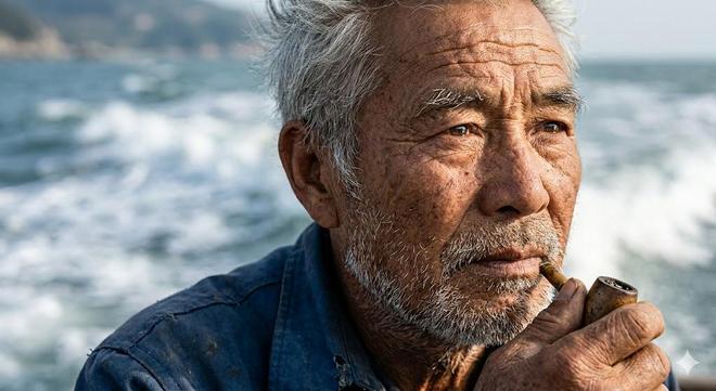 提示词:一位年约60岁的亚洲渔夫的超高清面部特写,海浪作为背景虚化。他脸上布满饱经风霜的皱纹和晒斑,皮肤纹理极其细腻,能看到细小的毛孔和银色的胡茬。阳光从侧面45度打来,照亮他半张脸,眼睛微眯,眼神中透露出坚毅与平静,眼球表面映出远处海平面的反光。画面锐度极高,皮肤质感真实到仿佛能触摸到。